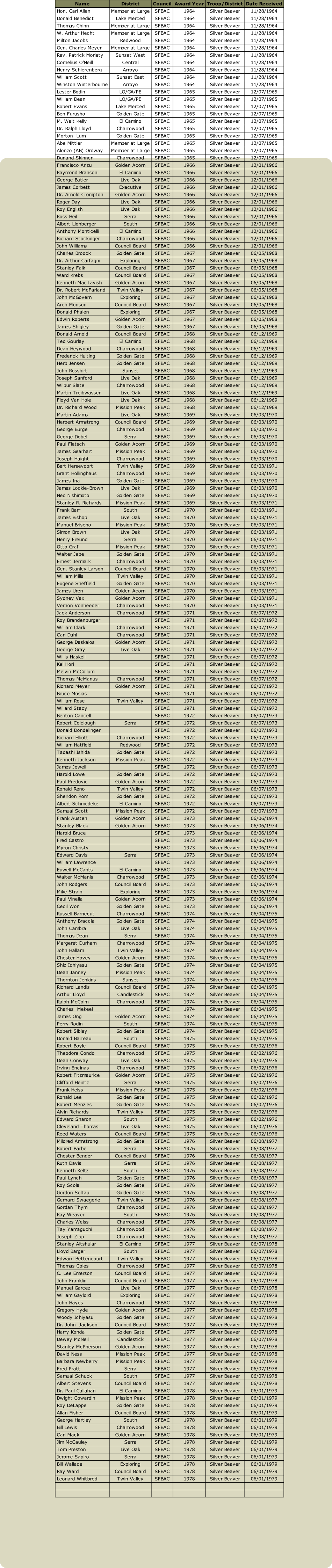 Between 1964 and 1978, approximately 200 members of the San Francisco Bay Area Council were awarded the Silver Beaver.  Below is the list of San Francisco Bay  Area Council members that have received the award during this period.